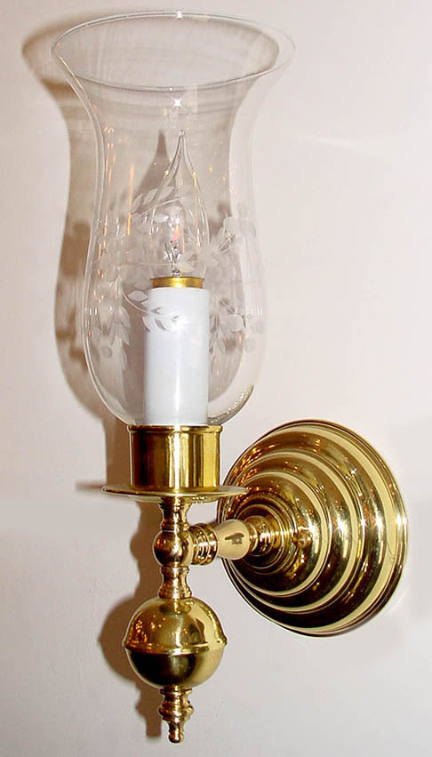 A simply gorgeous addition to any home or business. In high polish brass, this amazing reproduction colonial double wall sconce features crystal clear hurricane shades.